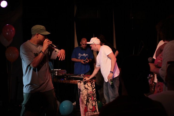 I saw a few people outside, and I remembered that the program was held down stairs. I jetted down those flight, and entered those doors, I searched around for Danielle and then on stage the Host and other cool familiar faces were telling a story with the music.. " ahhh I am here" . Danielle and I caught up, and we were debating not to paint, since they already started and neither of us wanted to disrupt the flow of things. Then there was a break and we talked for a few and Felecia Cruz was like.. " you better start painting! Its his birthday he really wanted to see some art created...!" I felt so bad... so Danielle and I thought to colabo to a her form board a portrait of him. We looked over many reference and stared at one.."yea.this one!'